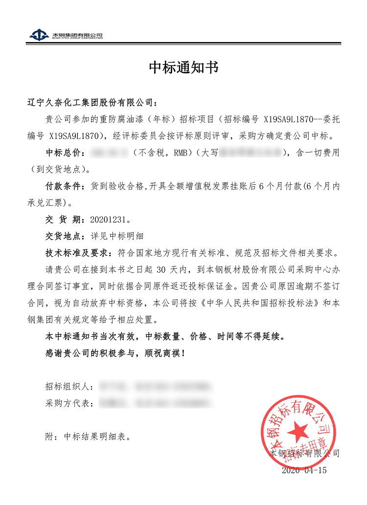 本鋼中標(biāo)通知書